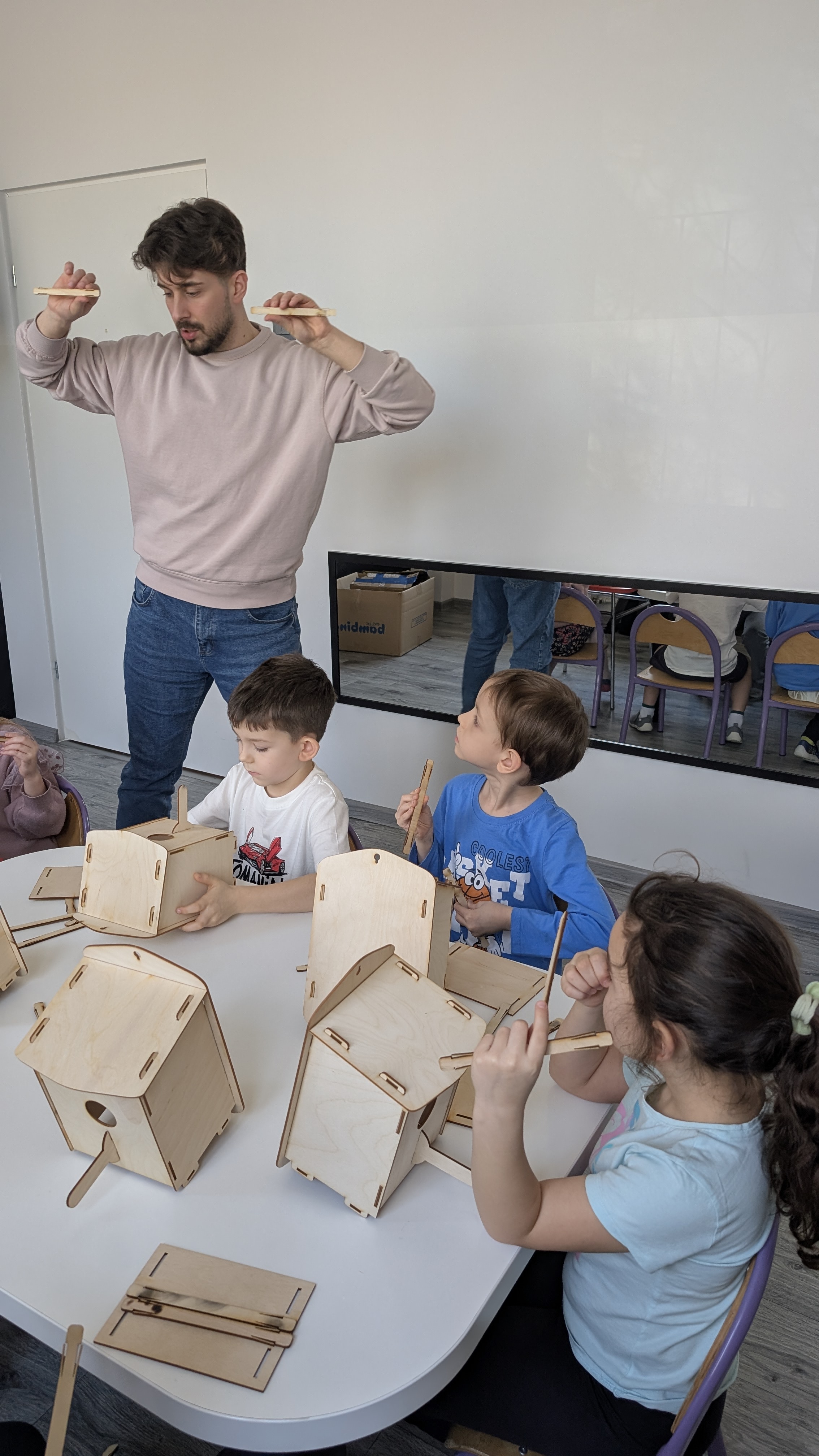 Po części wprowadzającej dzieci przystąpiły do działania. Pod czujnym okiem dorosłych dzieci łączyły elementy budek, skręcały je oraz sprawdzały, czy wszystkie części są dobrze dopasowane. Dla wielu uczestników była to pierwsza okazja do pracy z prawdziwymi elementami drewnianymi, co wzbudziło duże zainteresowanie i radość.