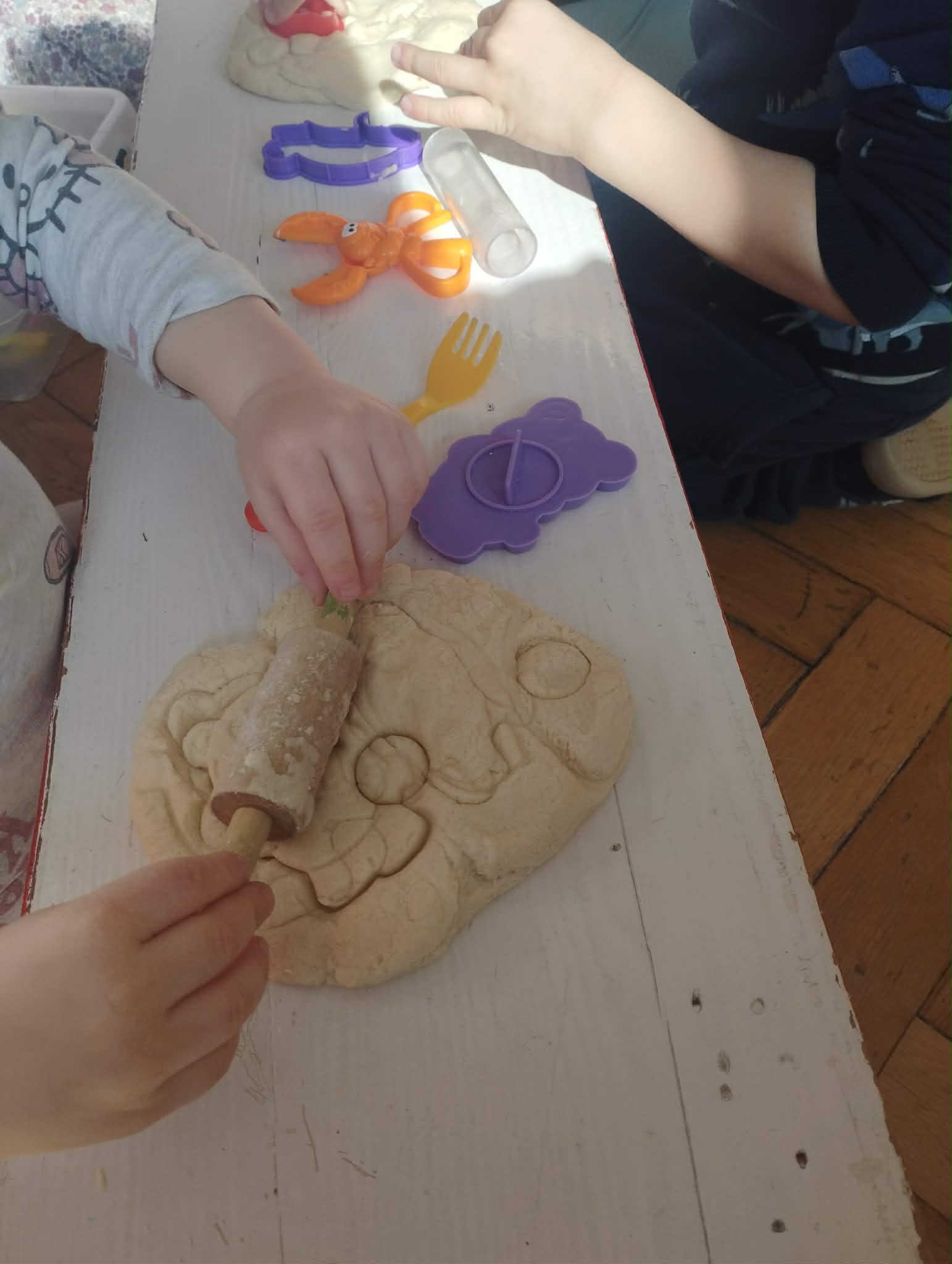 Nie zabrakło również tego, co dzieci kochają najbardziej – zabawy masą solną! Było mnóstwo foremek, wykrawaczy i różnorodnych narzędzi, dzięki którym mali odkrywcy mogli tworzyć, ugniatać i eksperymentować bez końca